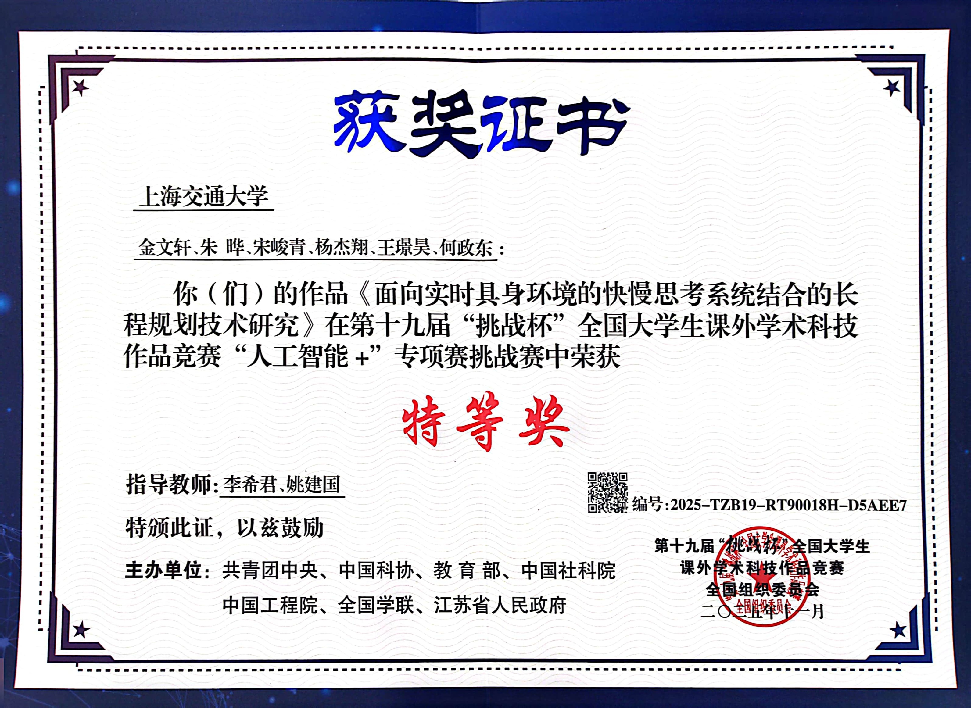 19th “Challenge Cup”, “AI+” Category, Grand Prize (第十九届挑战杯“人工智能+”专项赛特等奖) (as instructor), 2025, 共青团中央,中国科协,教育部等 [certificate]